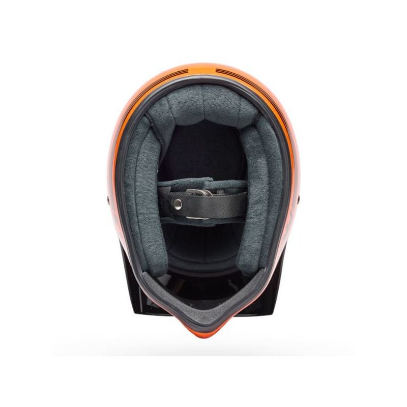 Sous sa coque brillante en fibre de verre se cache une structure renforcée, une mentonnière doublée EPS pour la protection et un intérieur en tissu éponge à l’ancienne, amovible et lavable. Le coloris orange brillant, saturé et éclatant, évoque l’âge d’or du tout-terrain US et les courses de flat track. Un vrai clin d’œil aux origines, à porter avec fierté sur route comme en ville.
