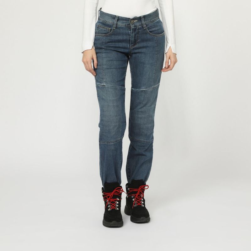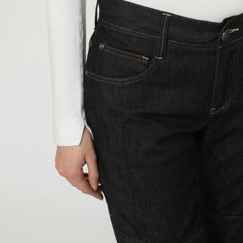Jean mejorada premium denim elástico, suave y duradero material de reforzado resistente a la abrasión colocada en las zonas más expuestas (en el lado exterior de las piernas, las rodillas y nalgas)