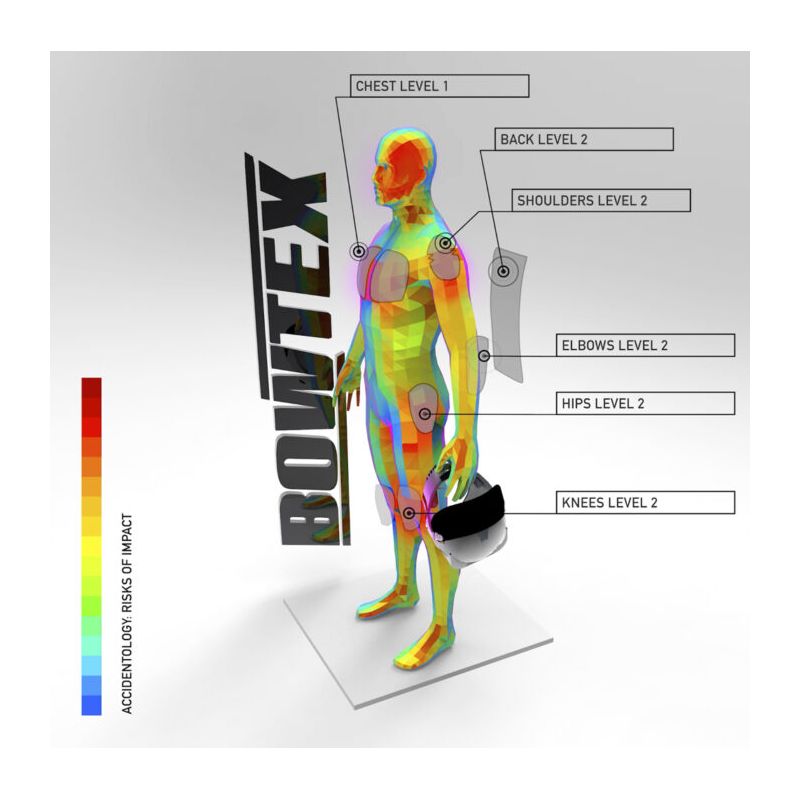 • Protections SAS-TEC de niveau 2 coudes, épaules incluses. Dorsale (niveau 1 et 2) et pectoraux (niveau 1) en option.